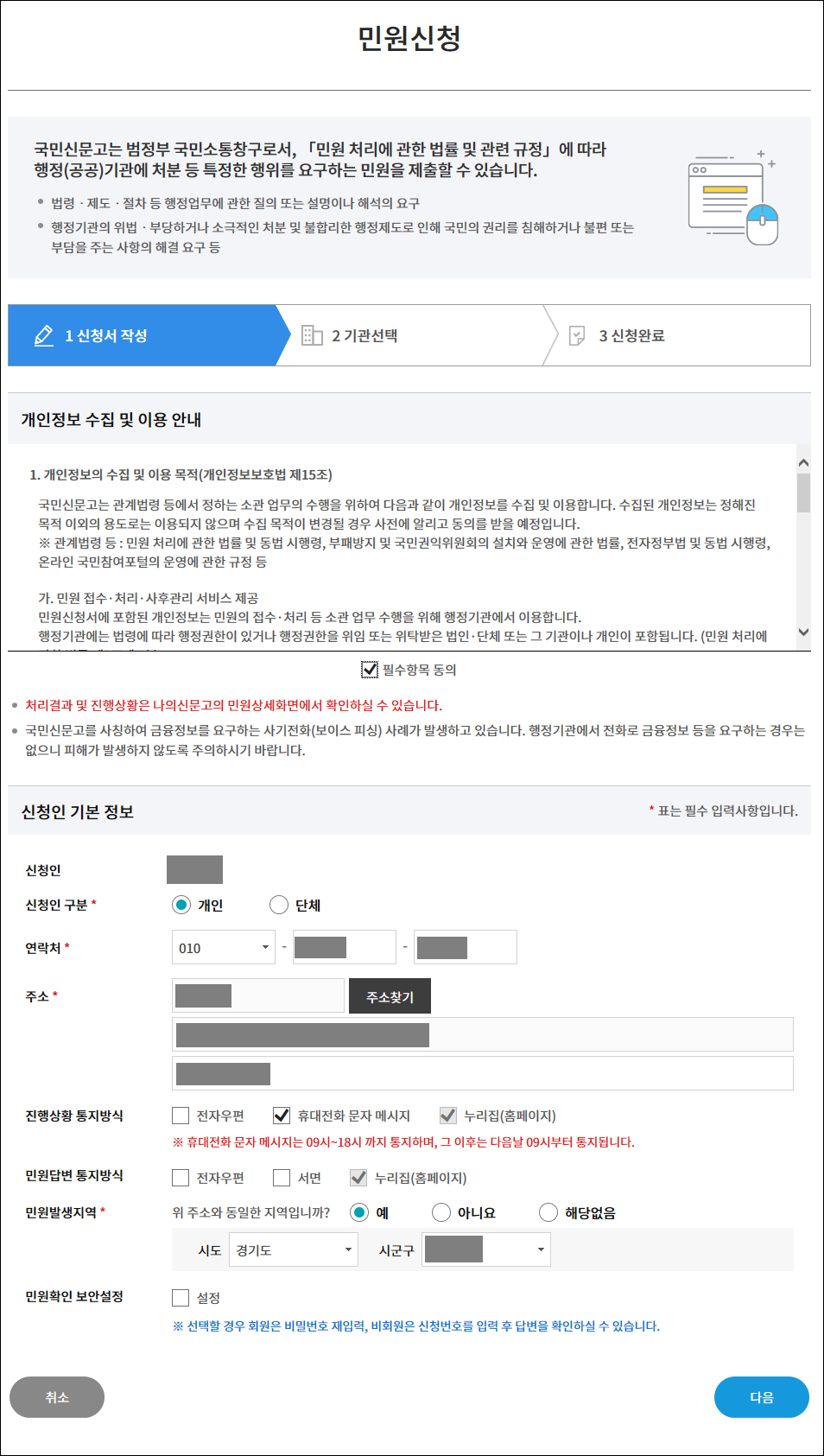 4. 로그인하고 나면 본격적으로 민원신청서 작성란이 나타납니다.