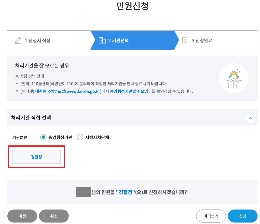 중앙행정기관의 경찰청을 선택하고, 우측 하단의 신청 아이콘을 클릭합니다.