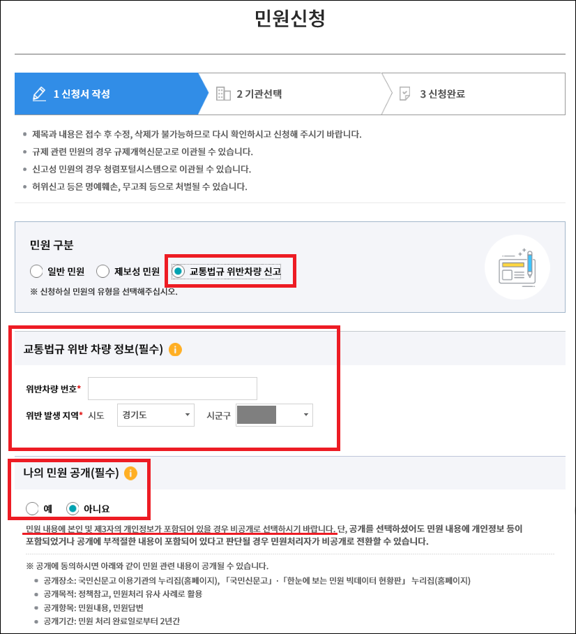 민원 제목에는 위반사항 (ex 신호위반, 차선위반 등)을 간단히 입력하고, 민원내용을 상세하게 적도록 합니다.