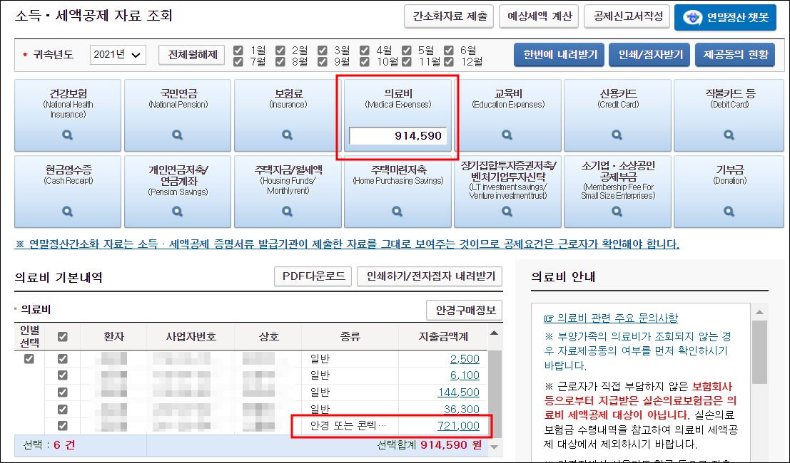 주의할 점은 시력보정 기능이 없는 콘택트렌즈, 선글라스 등의 구입비용은 의료비 세액공제 대상이 아니므로 구매내역이 조회되더라도 의료비 자료로 등록하면 안됩니다.