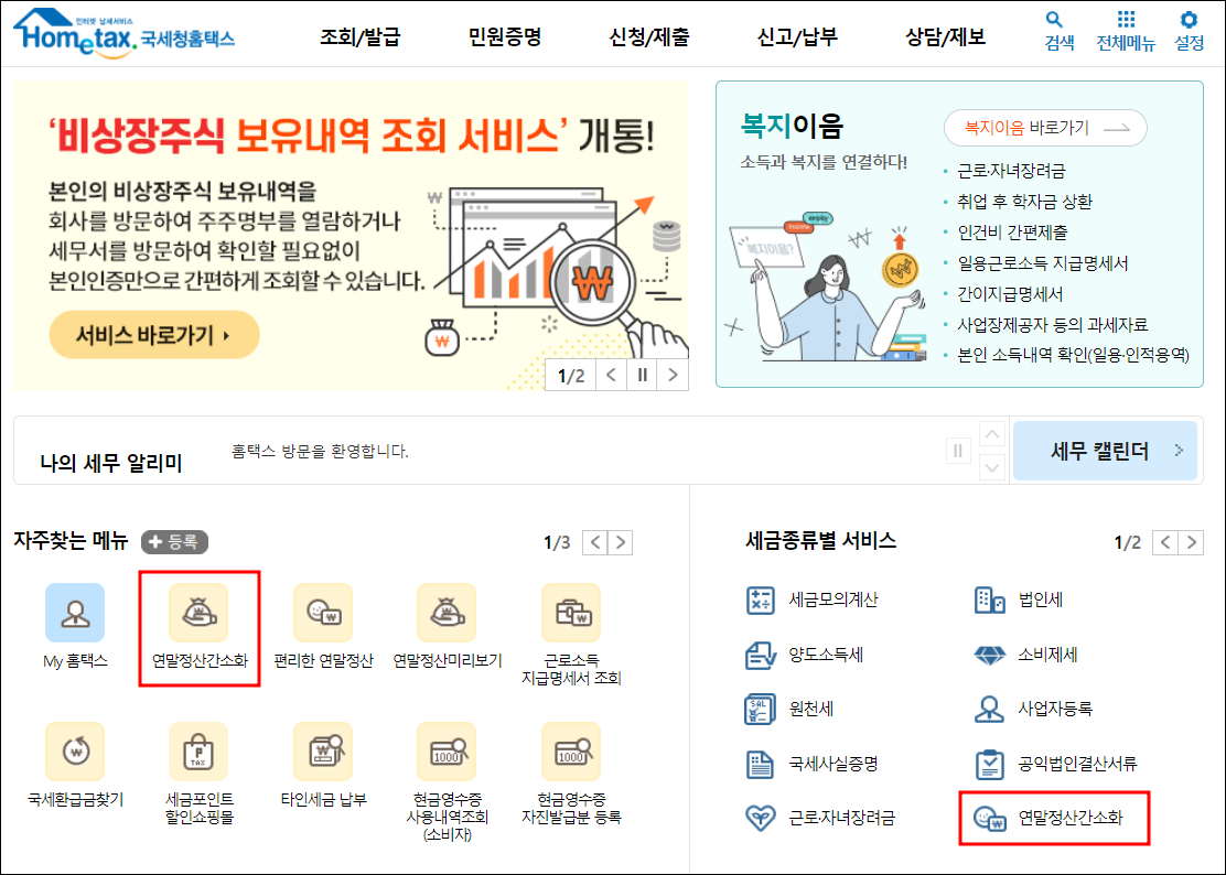 ▼ 공인인증서로 로그인 하고, 좌측의 [연말정산간소화] 또는 우측의 [연말정산간소화]를 클릭해줍니다.