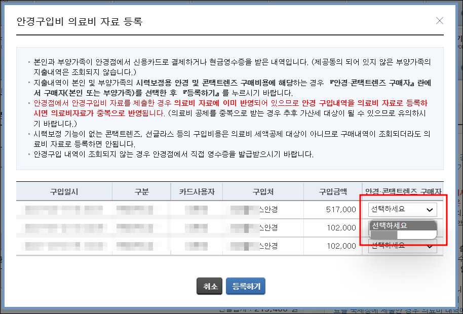 이중 의료비 공제대상으로 넣을 구매금액을 선택해 [안경 · 콘택트렌즈 구매자] 란에서 구매자를 선택해주세요.