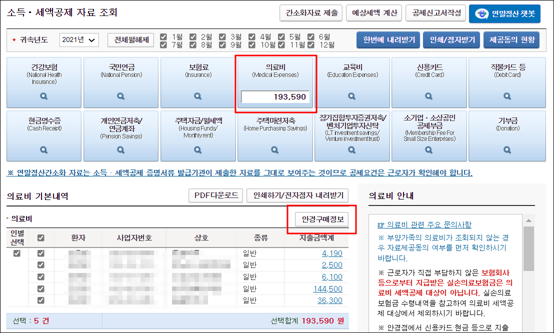 안경구입비는 연말정산 간소화서비스 조회 시 의료비 조회 내역에서 확인 할 수 있습니다.