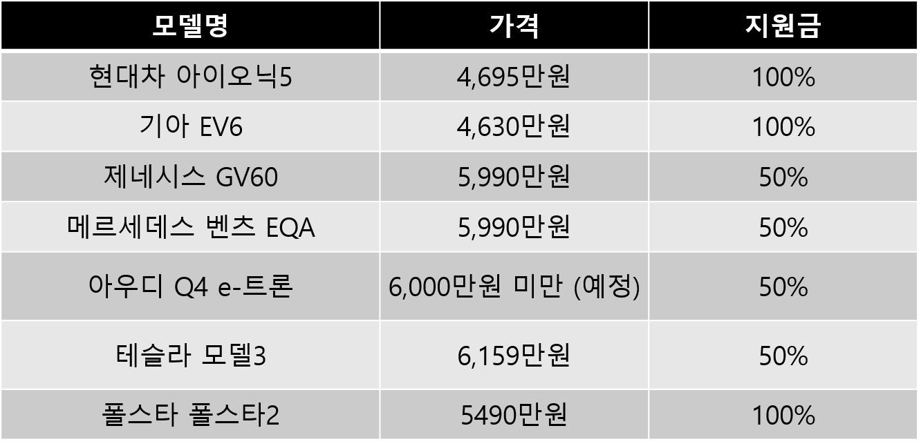 국내 출시된 주요 전기차 최저가격은 현대차 아이오닉5 4695만원, 기아 EV6 4630만원, 제네시스 GV60 5990만원, 메르세데스-벤츠 EQA 5990만원, 아우디 Q4 e-트론 6000만원 미만(예정), 테슬라 모델3 6159만원, 폴스타 폴스타2 5490만원 입니다.