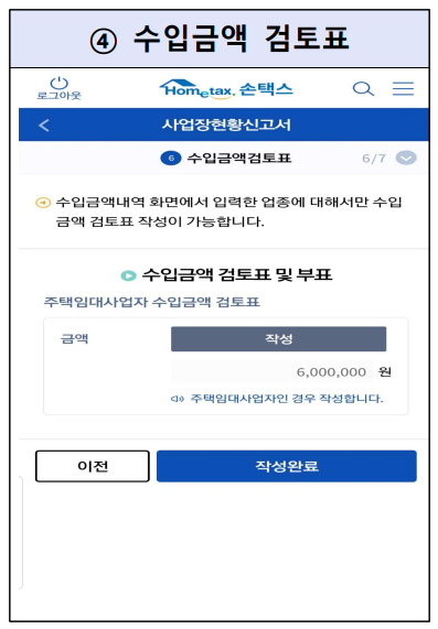 「수입금액 검토표」 작성의 전자신고 절차를 축소 및 이해하기 쉽게 개선하였고, 전년도 신고내용 및 주택 보유내역・부동산양도자료 불러오기 기능을 제공합니다. 또한 주택임대사업자 간주임대료 자동 계산기능이 추가되었습니다.