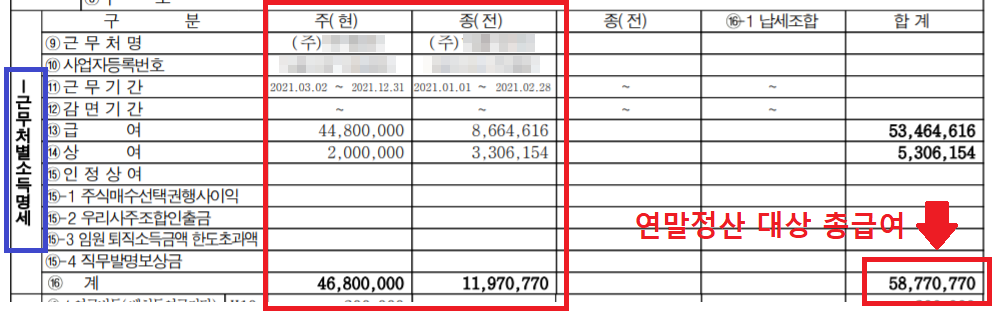 주(현) 급여와 종(전) 급여의 합계가 연말정산 대상 과세소득인 총급여가 됩니다.