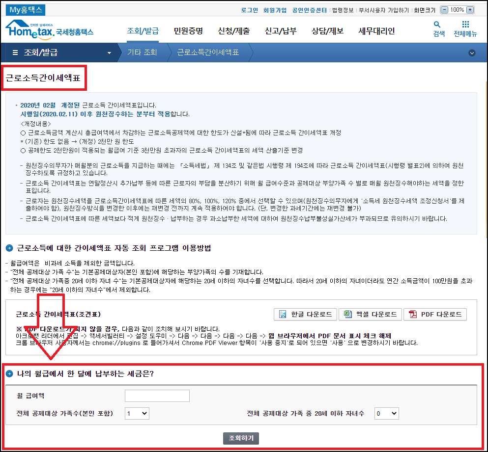 하단에 월급여액, 전체 공제대상 가족수, 가종 중 20세 이하 자녀수를 입력하고 조회를 클릭합니다.
