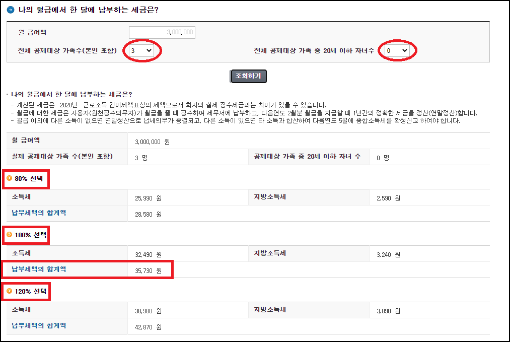 [월급여 300만원, 가족수 3명, 3명중 20세 이하 자녀 없는 경우]_소득세 35,730원 (지방세 포함)