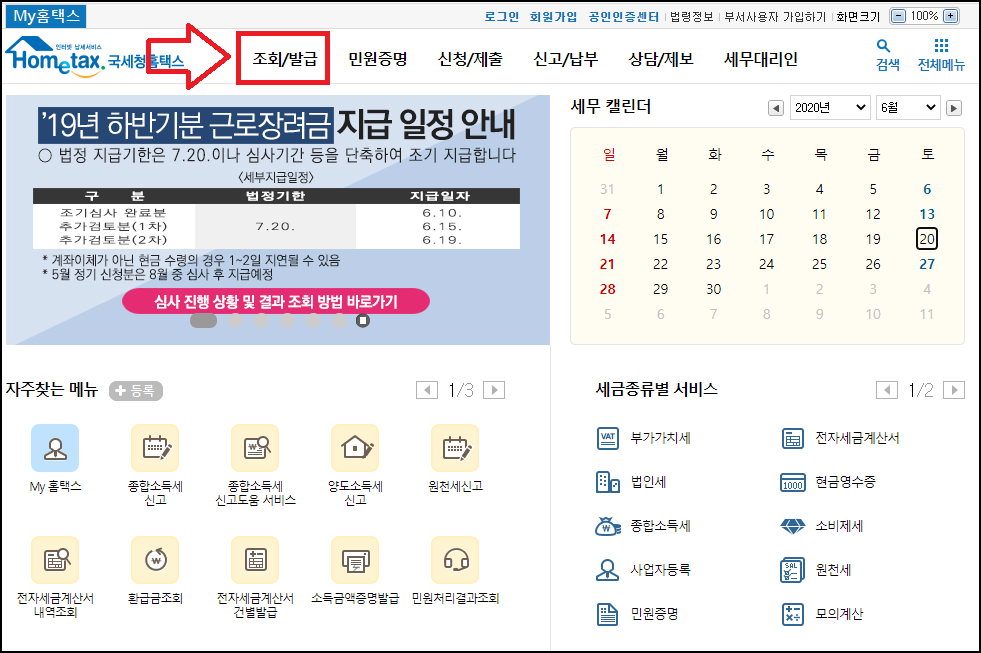 2. 홈택스 메인화면의 [조회/발급]을 선택합니다.