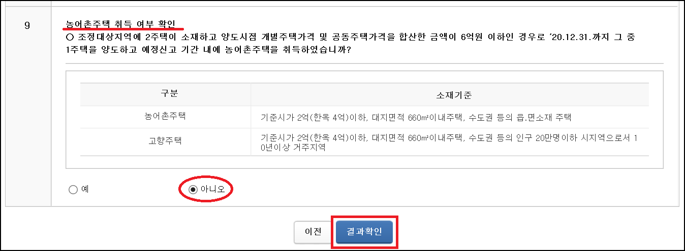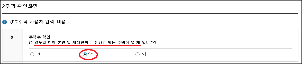 아파트 2채를 보유하고 있는것으로 가정 하였기 때문에 [아니오]를 선택합니다.