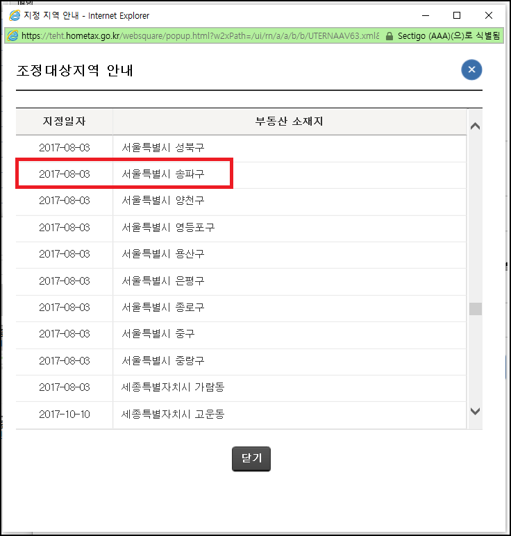 조정대상지역 지정일 조회를 클릭하면 부동산 소재지 별로 지정일자를 확인 할 수 있습니다.